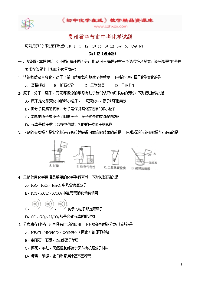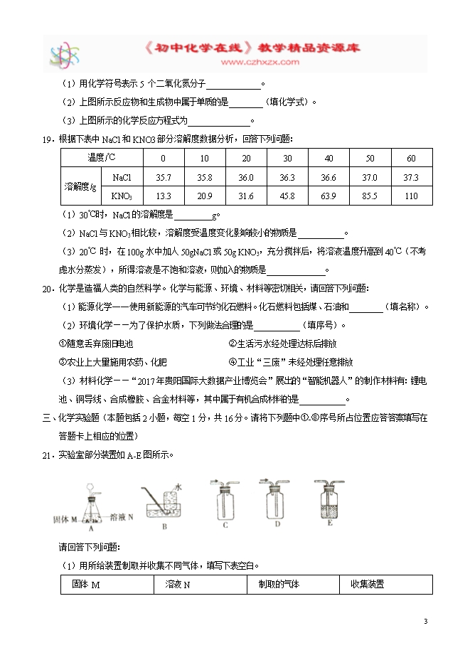 2017年贵州省毕节市中考理综(化学部分)试题(精校word版,无答案)