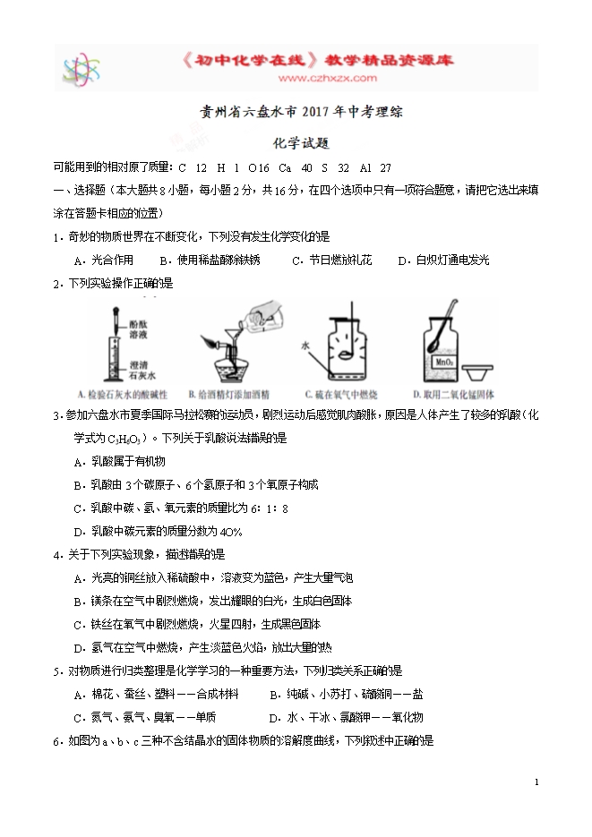 2017年贵州省六盘水市中考理综(化学部分)试题(精校word版,含答案)
