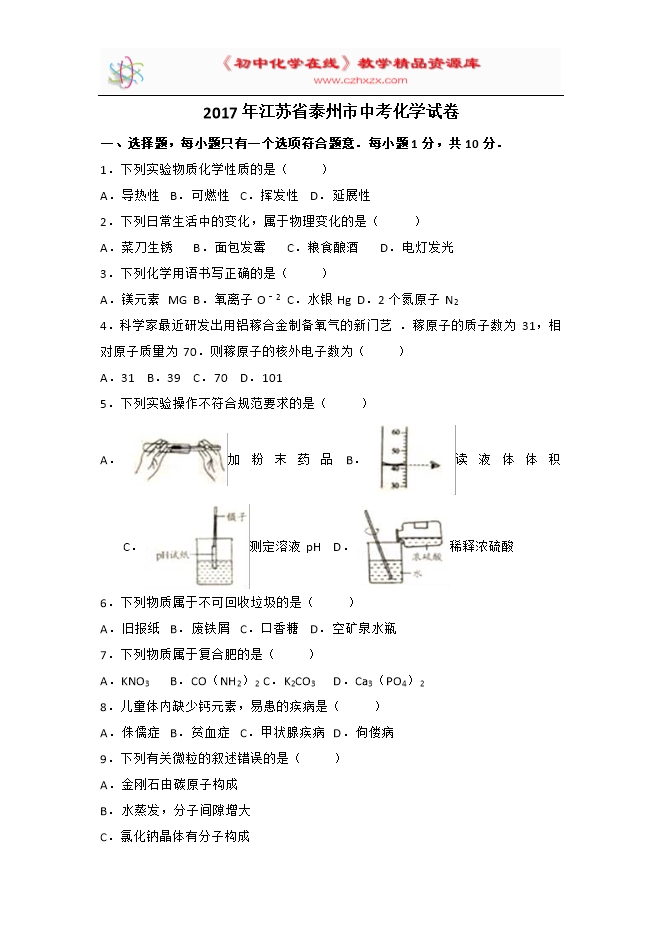 2017年江苏省泰州市中考化学试题(word版,含解析)