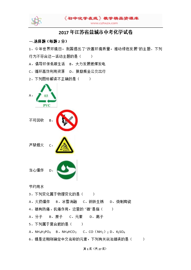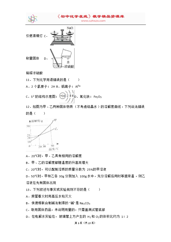 - 下一份试卷:2017年江苏省苏州市中考化学试卷(解析版)