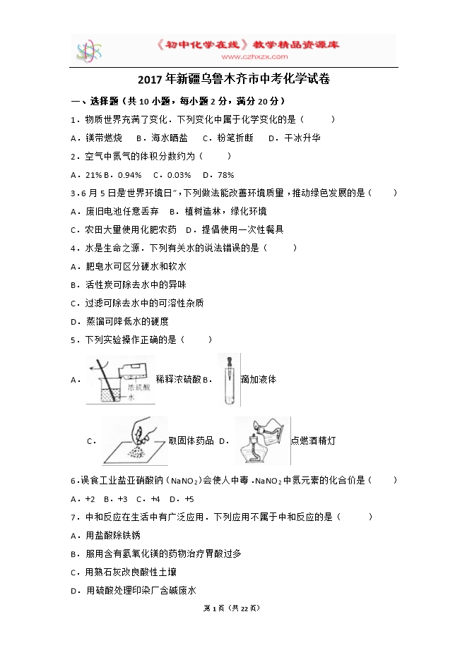 2017年新疆乌鲁木齐市中考化学试卷(解析版)