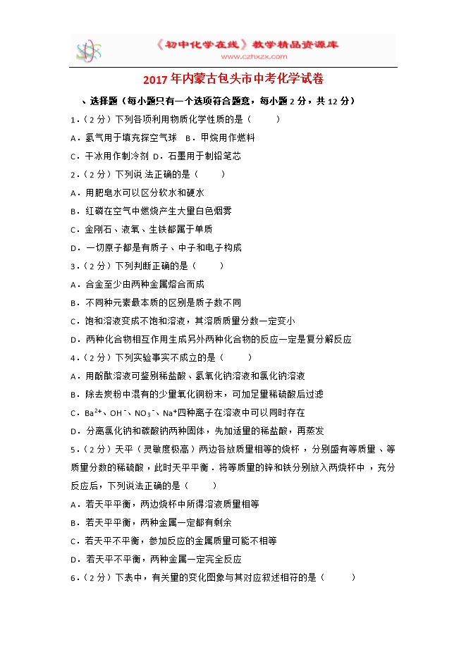 2017年内蒙古包头市中考化学试题(Word版含解析)