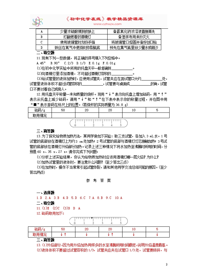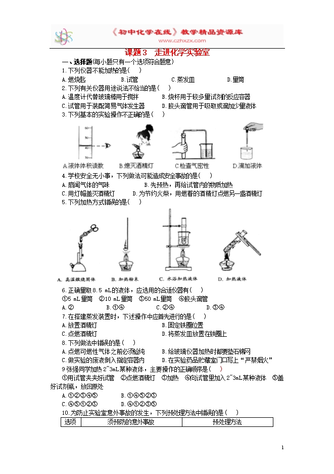 2017秋人教版九年级化学上册《第一单元课题3 走进化学实验室》同步训练(word版含答案)