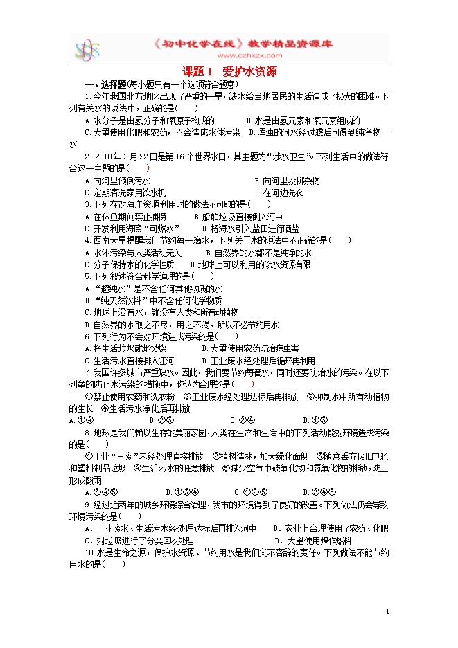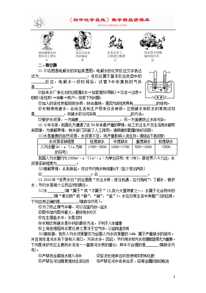 2017秋人教版化学九年级上册《第四单元课题1 爱护水资源》同步训练(word版含答案)
