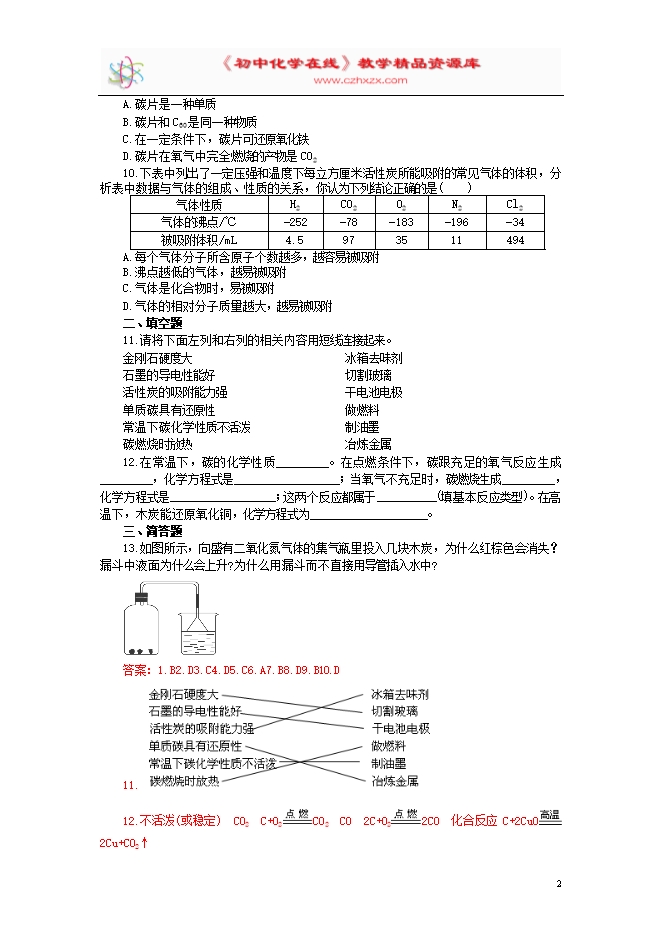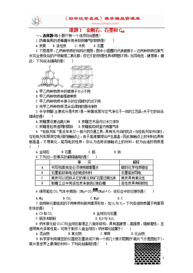 2017秋人教版九年级化学上册《第六单元课题1 金刚石、石墨和C60》同步训练(word版含答案)