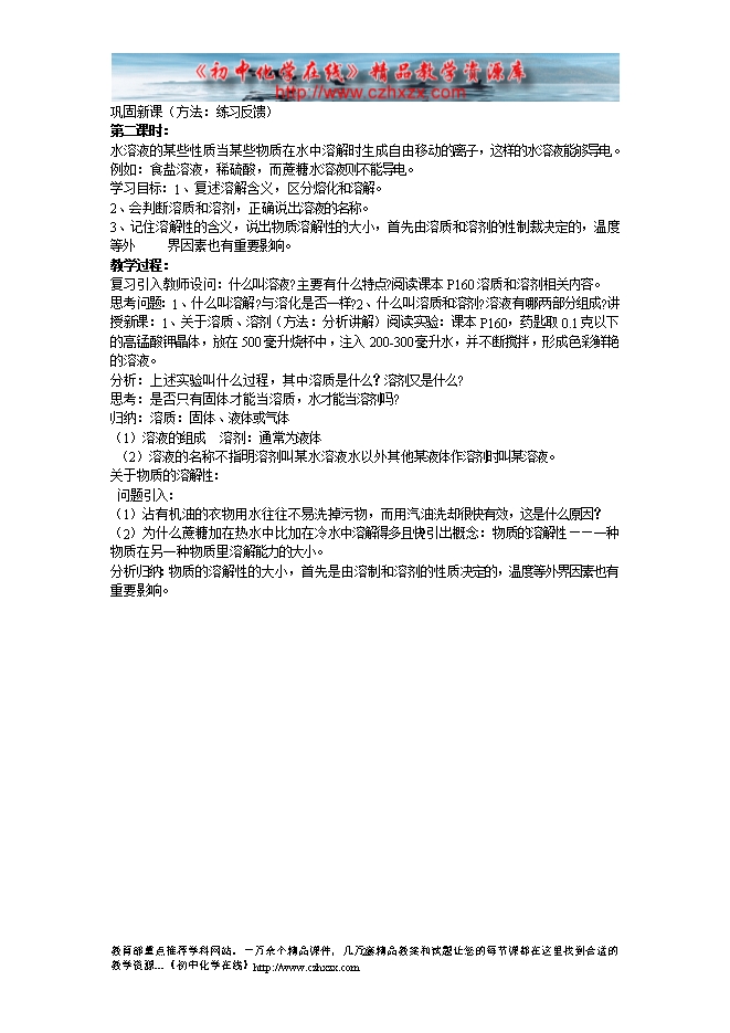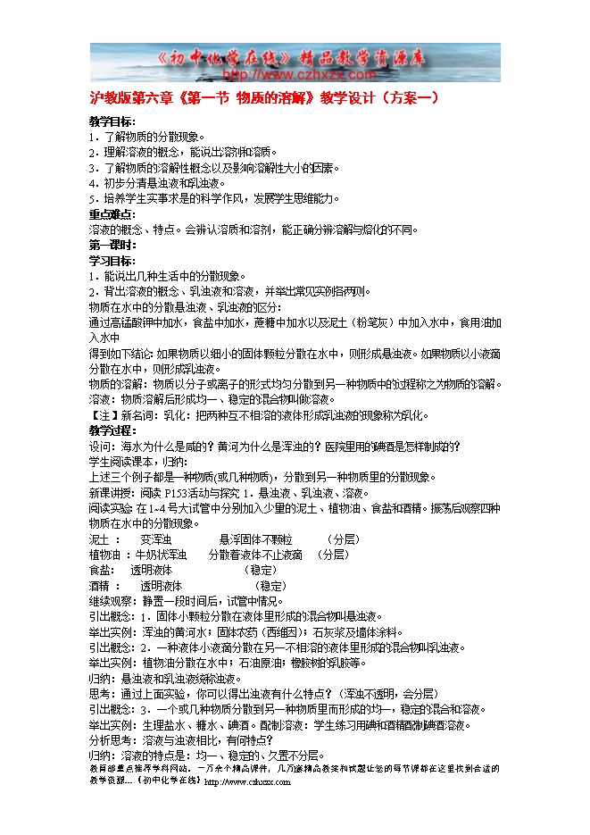 沪教版初中化学《第六章第一节 物质在水中的分散》教学设计(方案一)