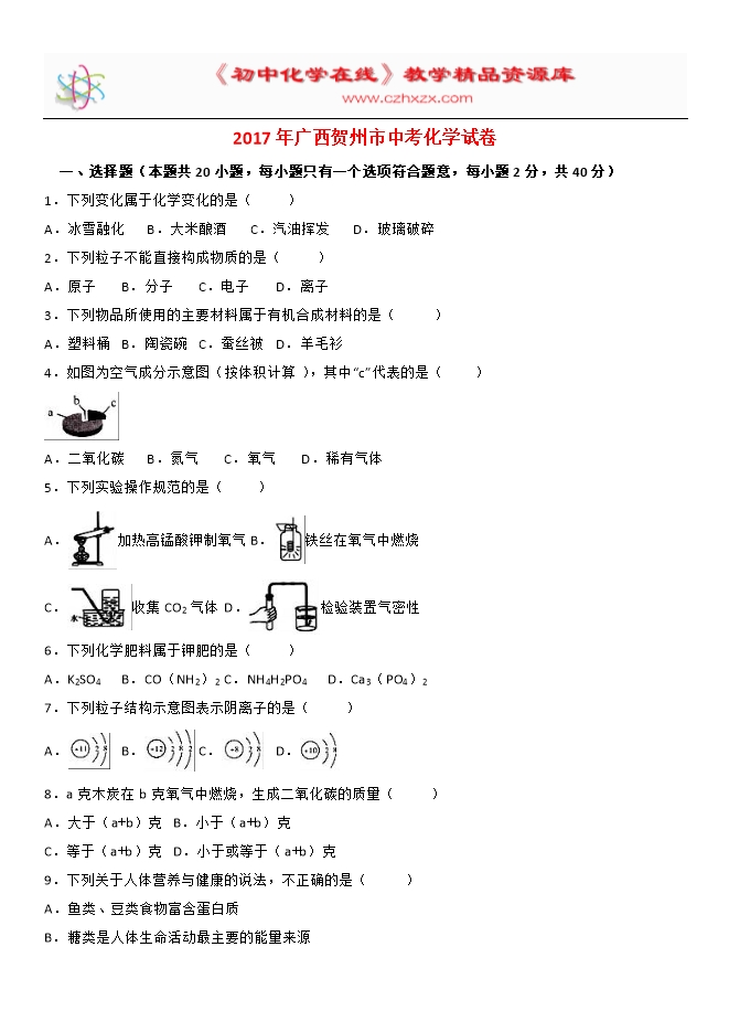2017年广西贺州市中考化学试题(word版含解析)