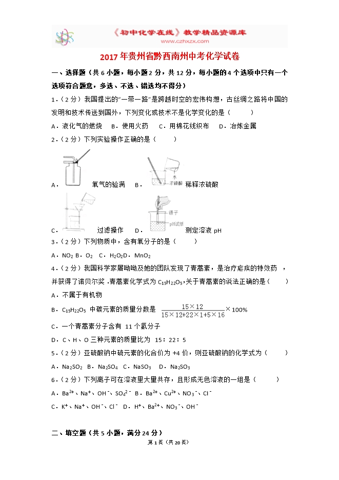 【内容简介】2017年贵州省黔西南州中考化学试卷(Word版含解析)