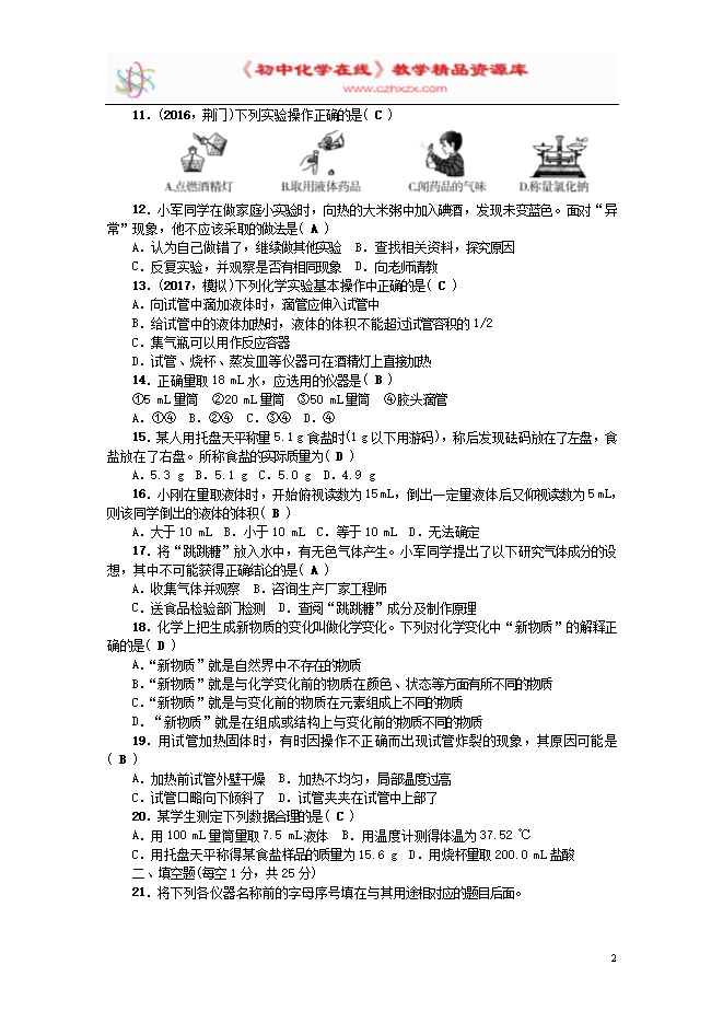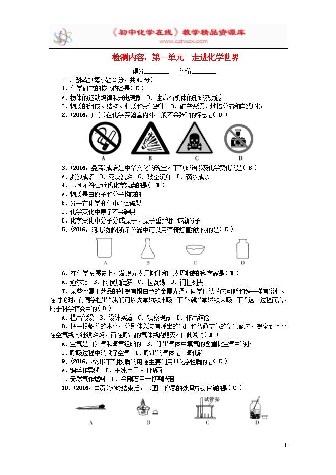 2017秋人教版九年级化学上册《第一单元 走进化学世界》单元检测(word版含答案)