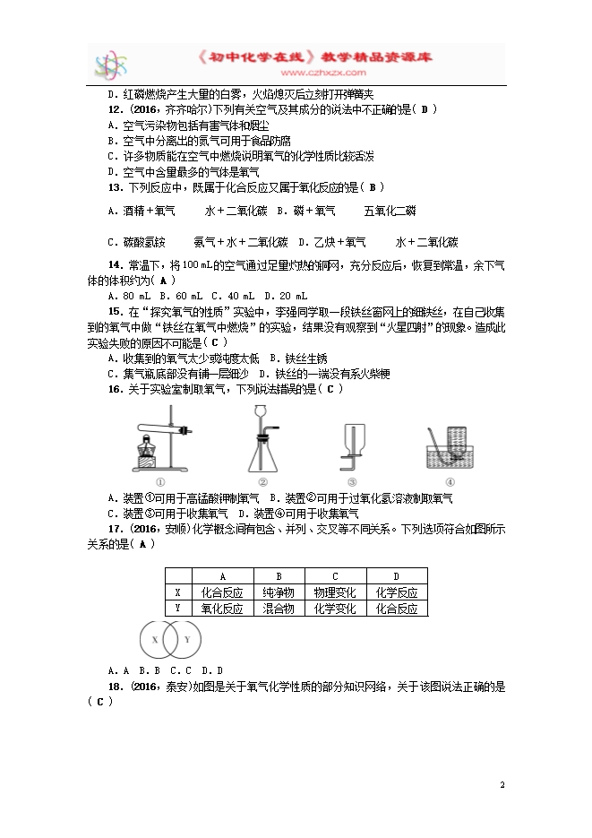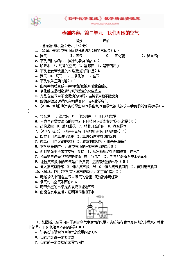 2017秋人教版九年级化学上册《第二单元 我们周围的空气》单元检测(word版含答案)