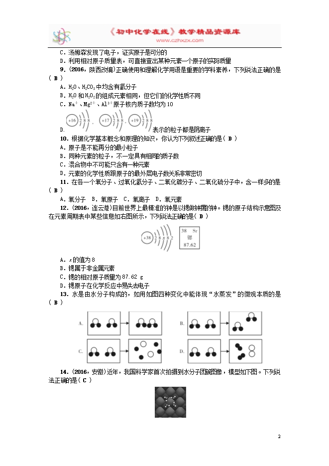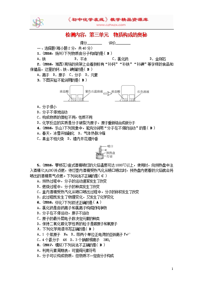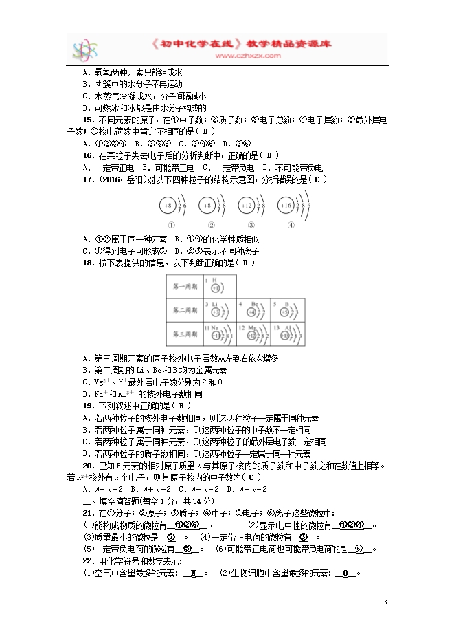 2017秋人教版九年级化学上册《第三单元 物质构成的奥秘》单元检测(word版含答案)