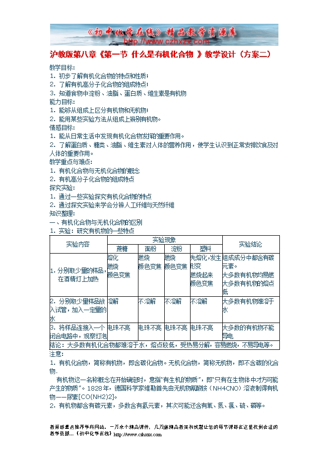 沪教版初中化学《第八章第一节 什么是有机化合物 》教学设计(方案二)