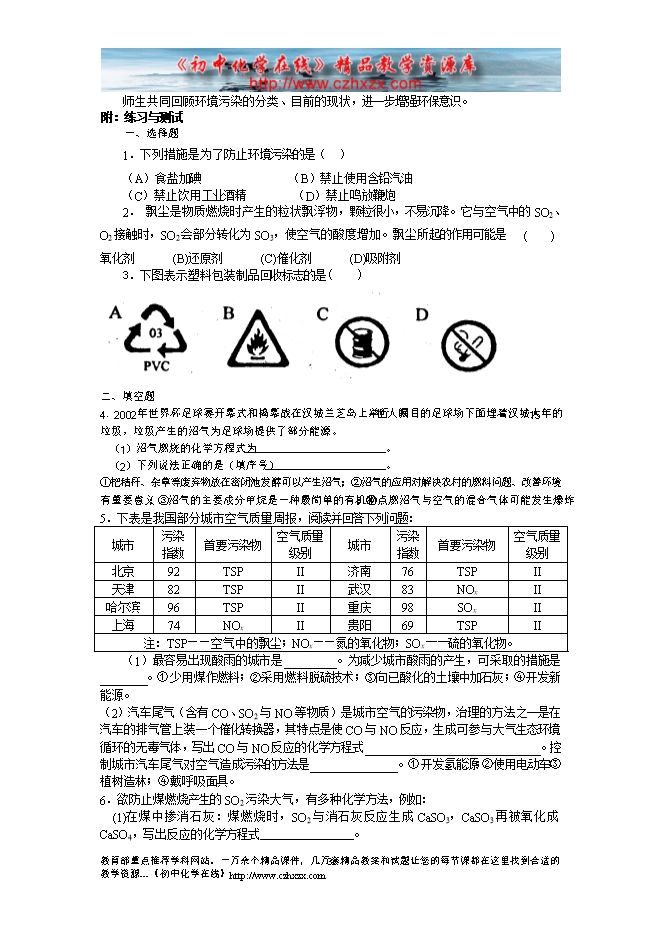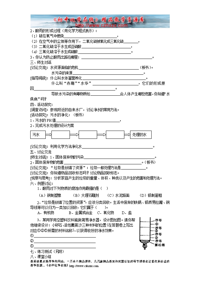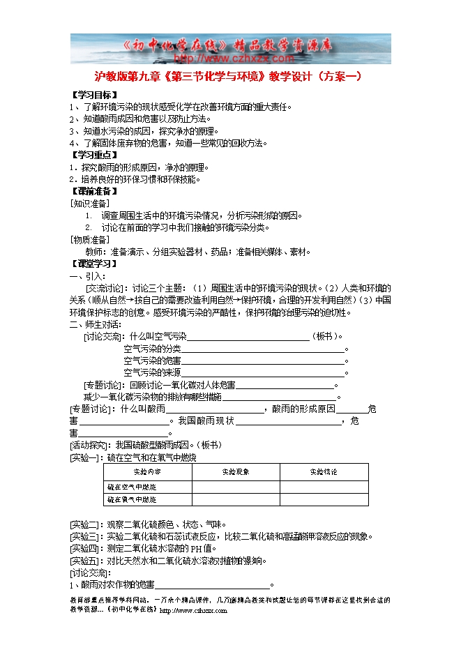 沪教版初中化学《第九章第三节 环境污染的防治》教学设计(方案一)
