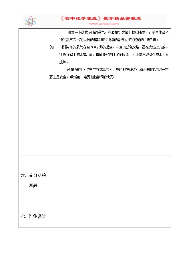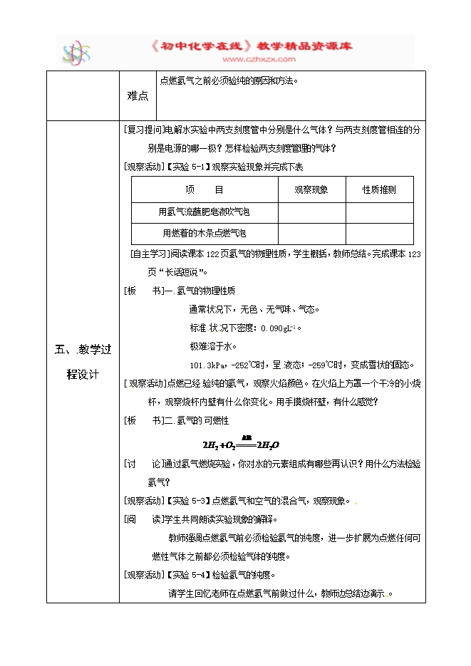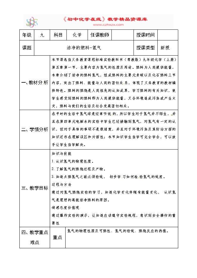 陕西省石泉县池河中学九年级化学上册《5.1洁净的能源-氢气》教案(科粤版)