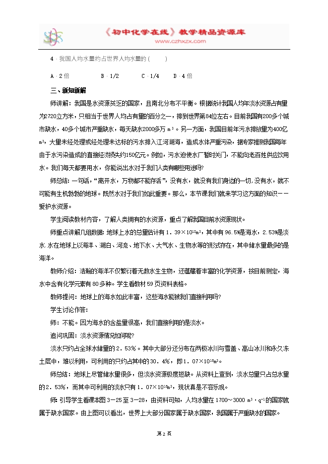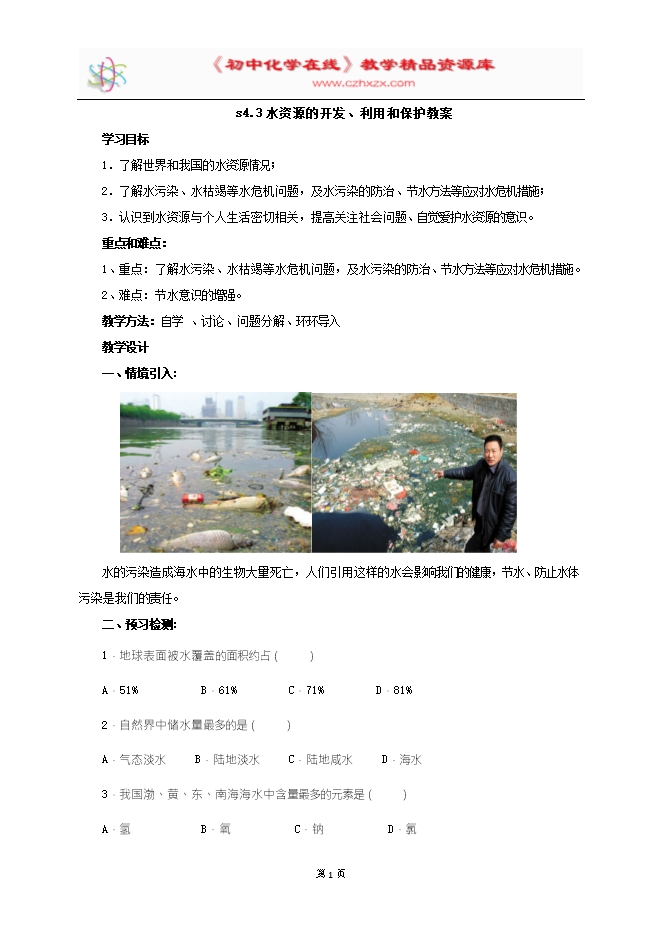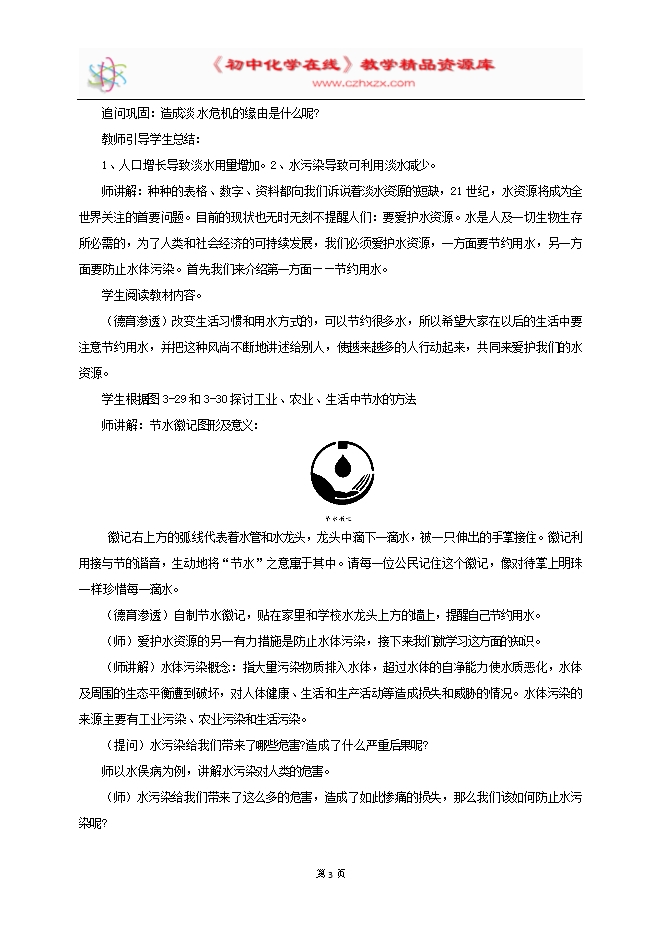 京改版九年级化学上册《4.3水资源的开发、利用和保护》教案