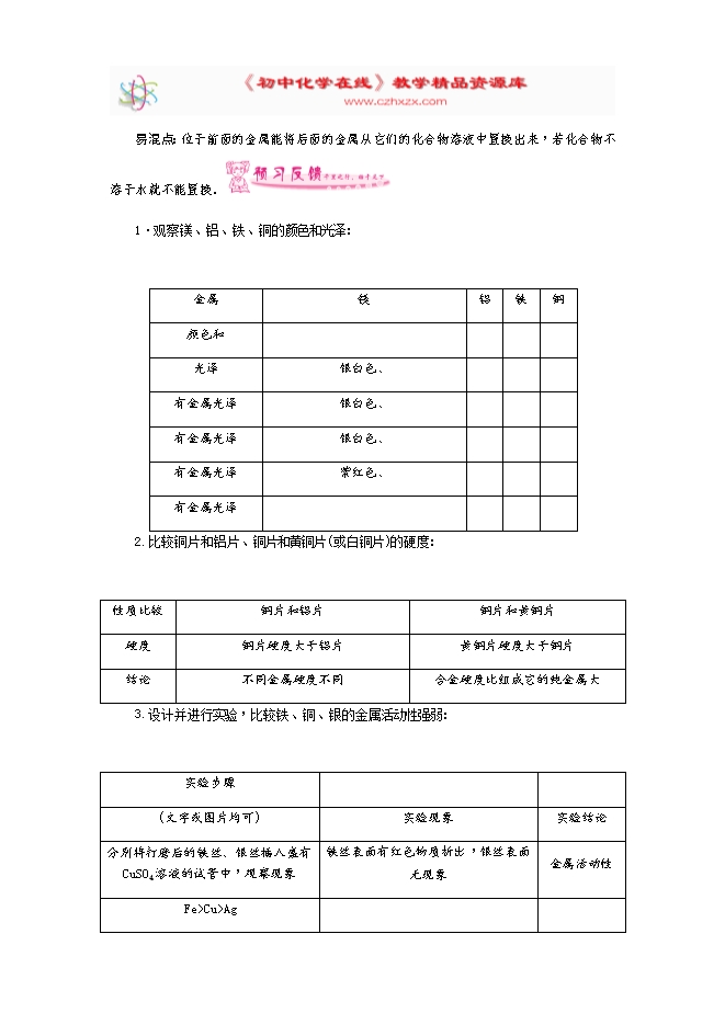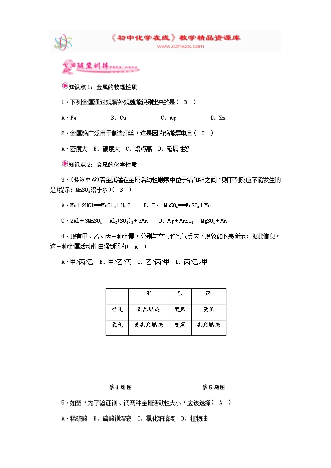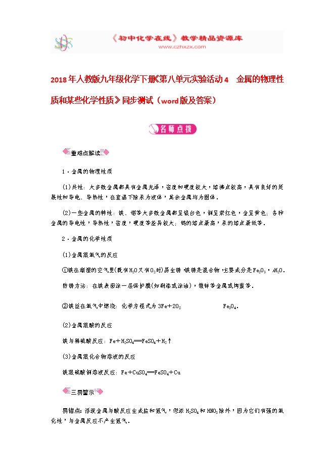 2018年人教版九年级化学下册《第八单元实验活动4 金属的物理性质和某些化学性质》同步测试(word版及答案)