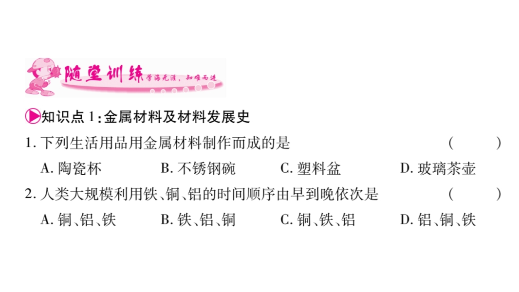 - 4462019-2020学年人教版九年级化学下册《课题8.1 金属材料》同步练习(原卷版)