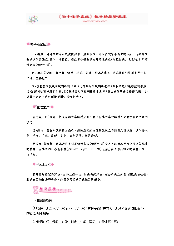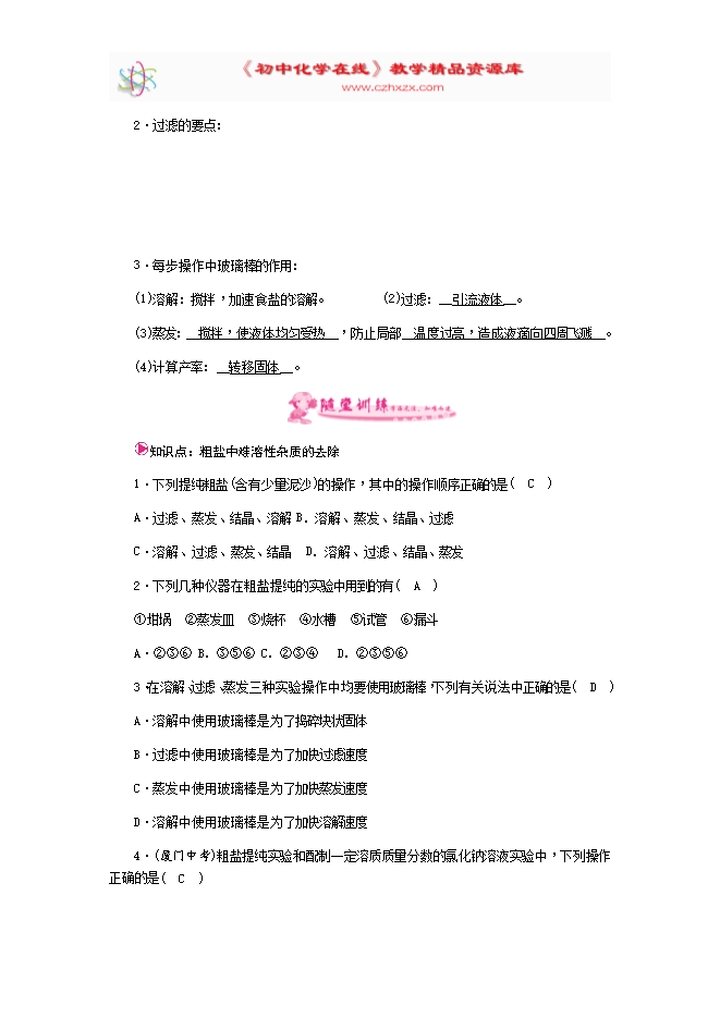 2018年人教版九年级化学下册《第十一单元实验活动8 粗盐中难溶性杂质的去除》同步测试(word版含答案)