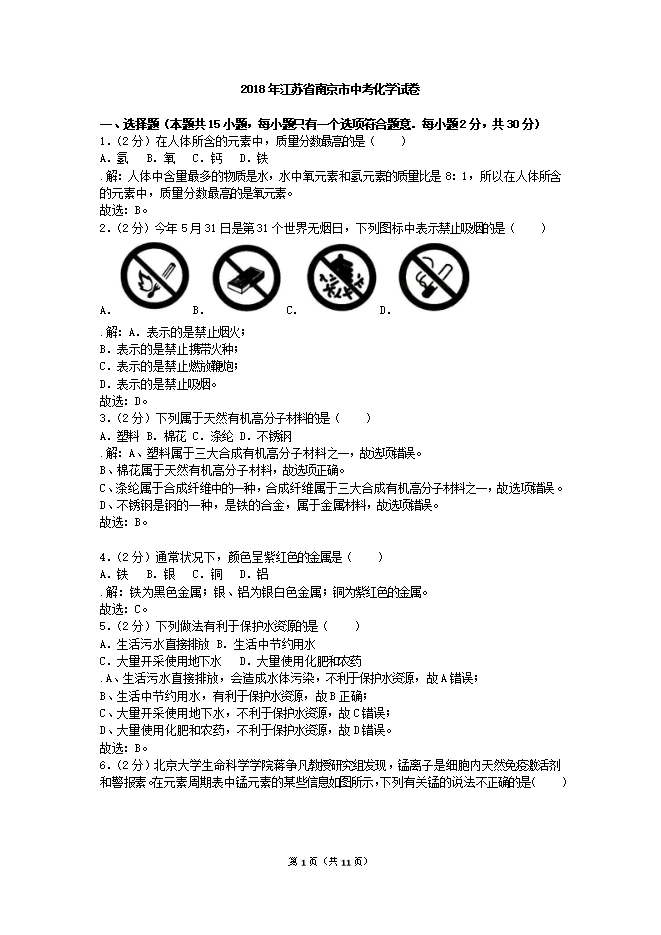 2018年江苏省南京市中考化学试卷(word版含答案解析)