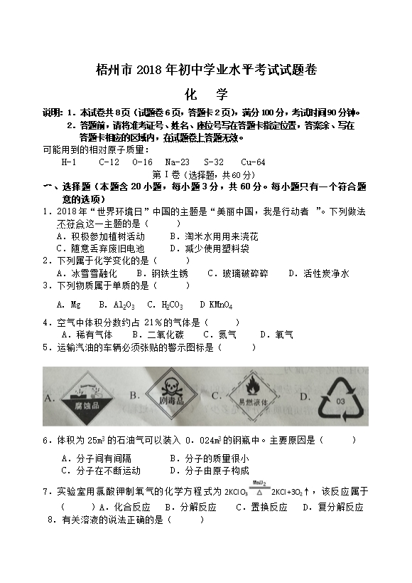 2018年广西梧州市中考化学试题(word版,含答案)