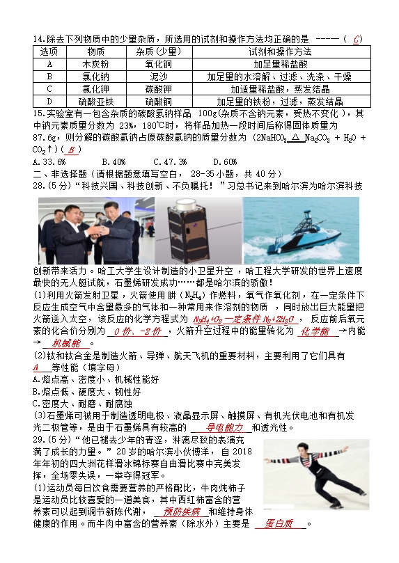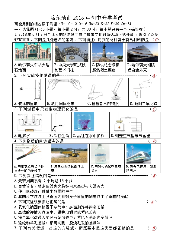 2018年黑龙江省哈尔滨市中考化学试题(word版,含答案)