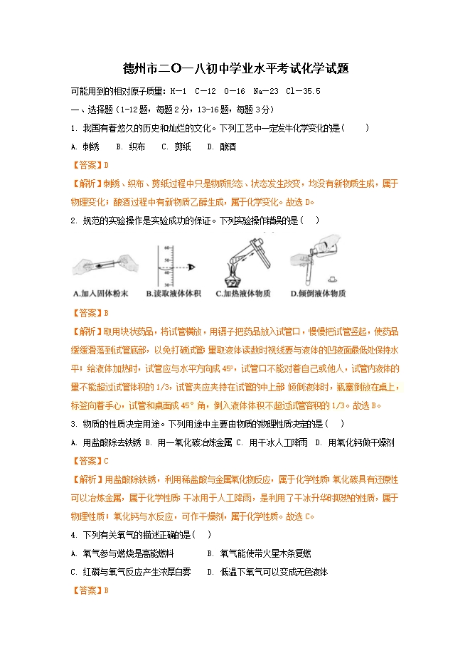 2018年山东省德州市中考化学试卷(word版含答案解析)