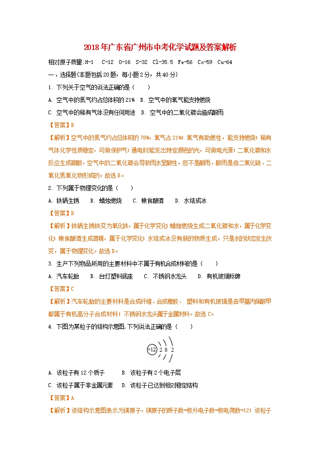 2018年广东省广州市中考化学试题(word版含答案解析 )