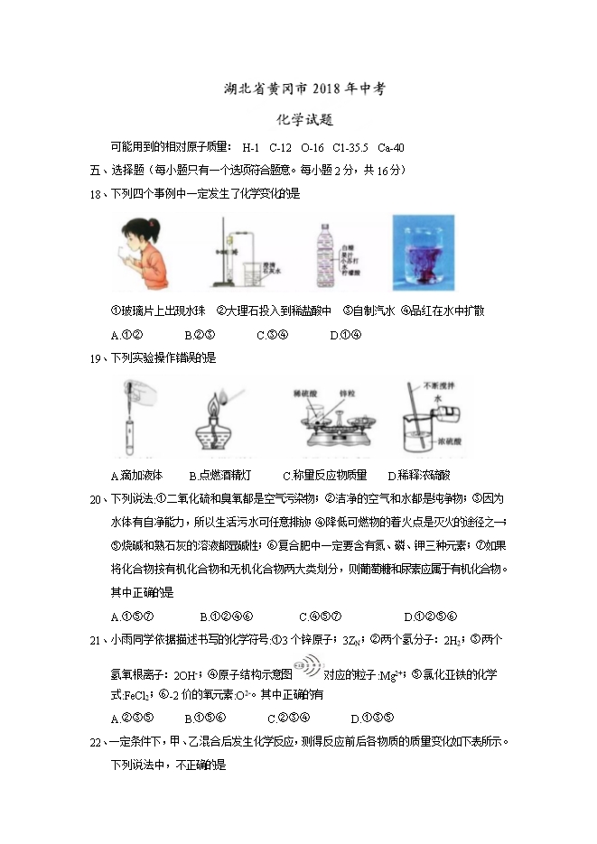 2018年湖北省黄冈市中考化学试题(Word版,含答案)