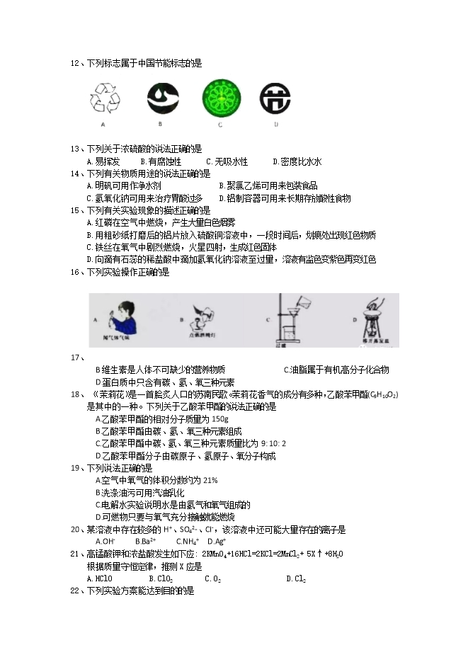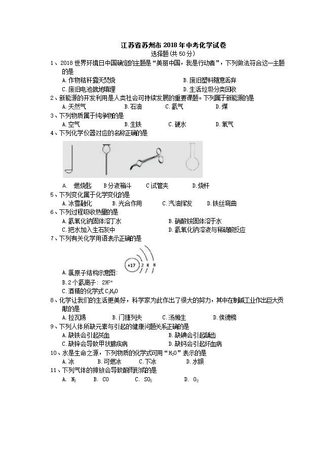 2018年江苏省苏州市中考化学试题(word版,含答案)