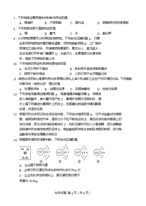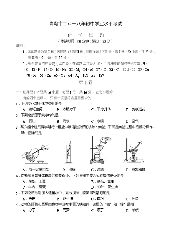 2018年山东省青岛市中考化学试题(word版,含答案)