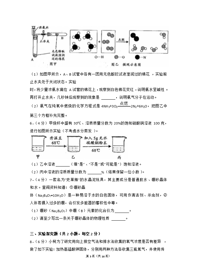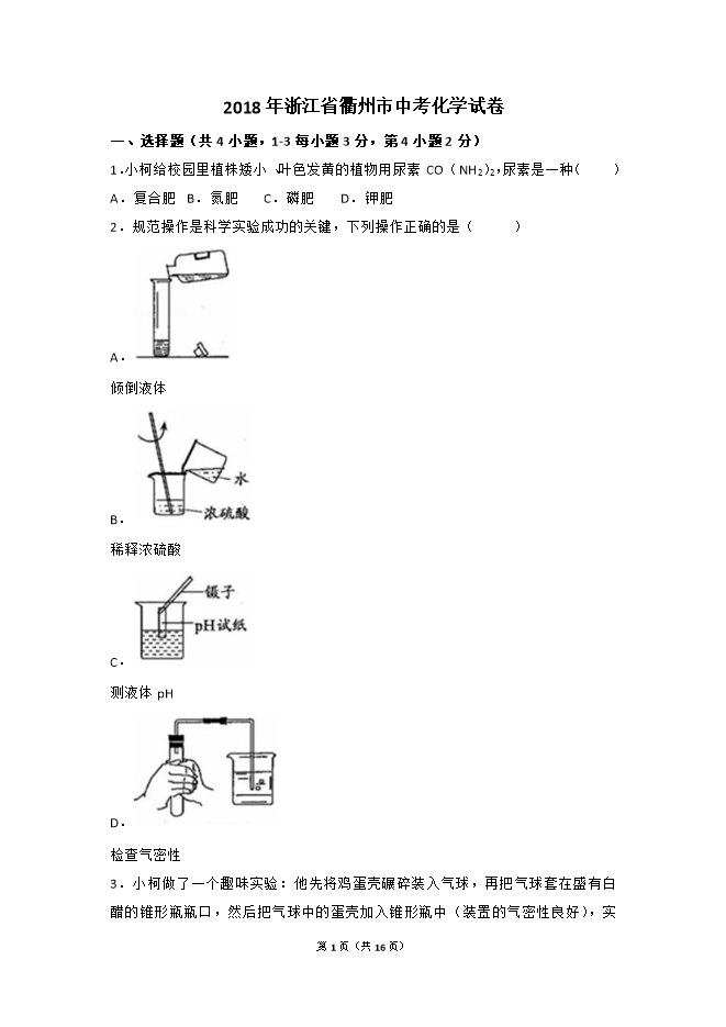 2018年浙江省衢州市中考化学试题(word版,含答案解析)