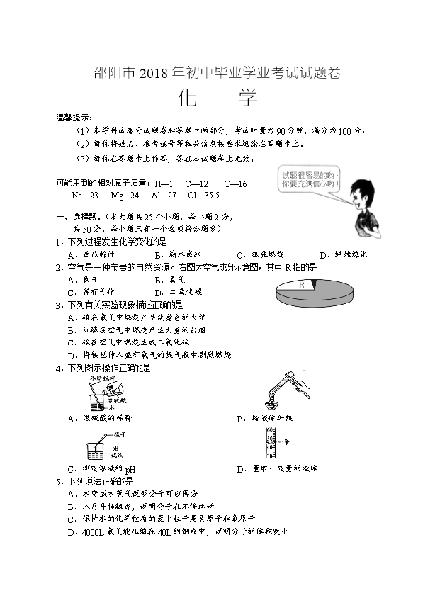2018年湖南省邵阳市中考化学试题(word版,含答案)