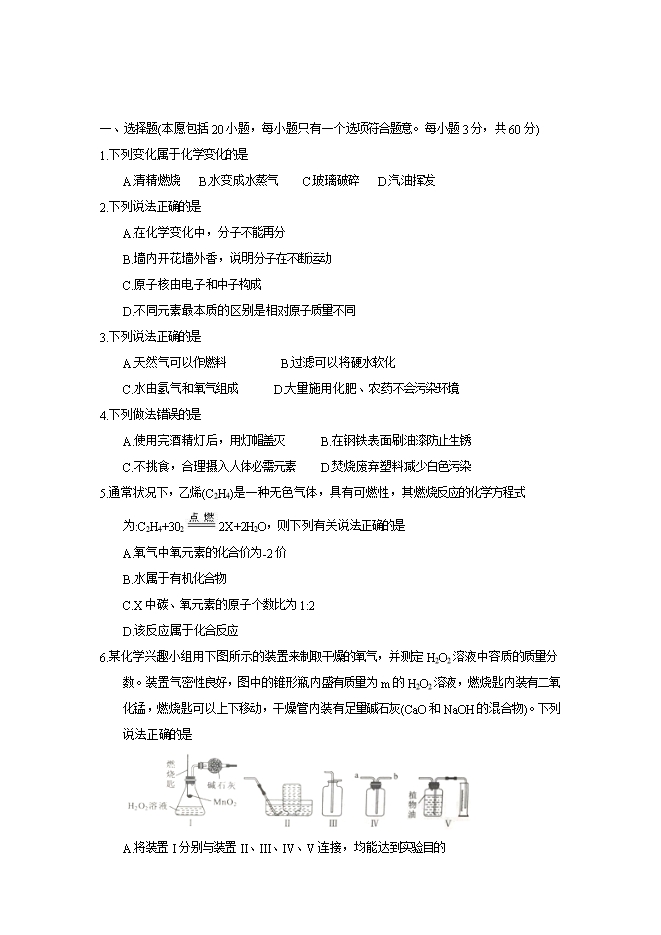2018年湖北省武汉市中考化学试题(word版,含答案)