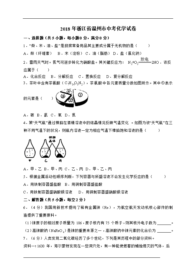 2018年浙江省温州市中考化学试题(word版含答案解析)