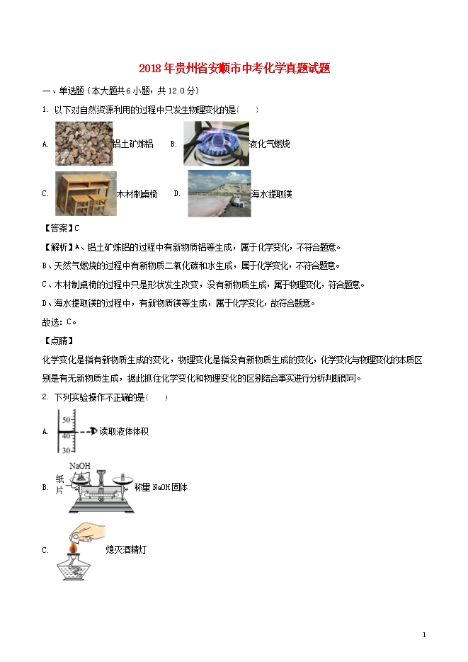 2018年贵州省安顺市中考化学试题(word版,含答案解析)