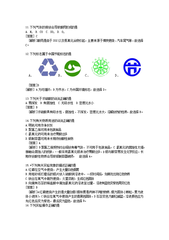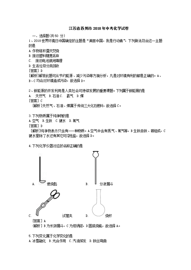 2018年江苏省苏州市中考化学试题(word版,含答案解析)