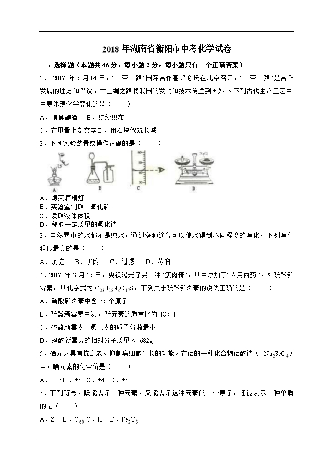 2018年湖南省衡阳市中考化学试卷(word版,含答案解析)