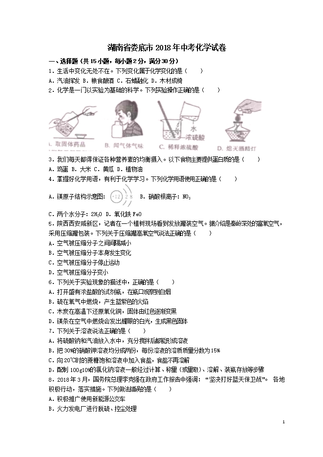2018年湖南省娄底市中考化学试卷(WORD版,含答案)