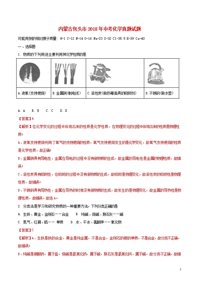 2018年内蒙古包头市中考化学试题(word版,含答案解析)