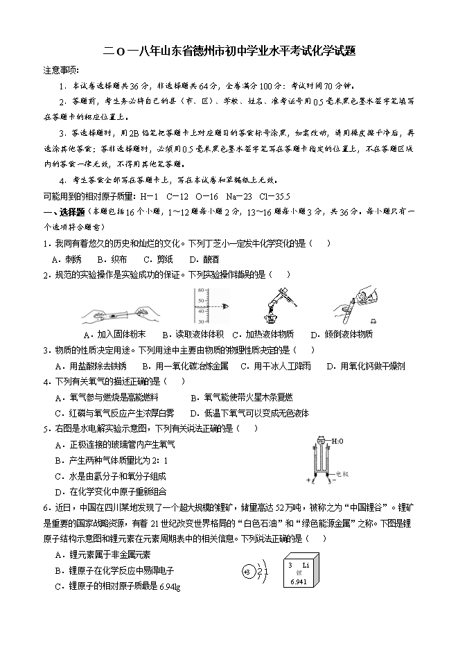 所属专辑: 《2018年各省市中考化学真题》专辑