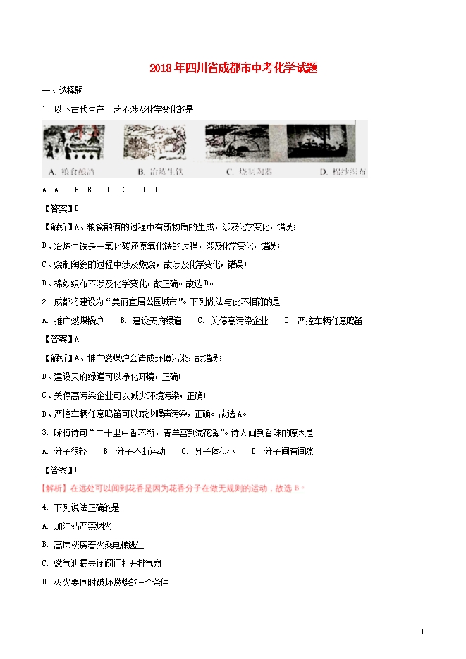 2018年四川省成都市中考化学试题(word版,含答案解析)