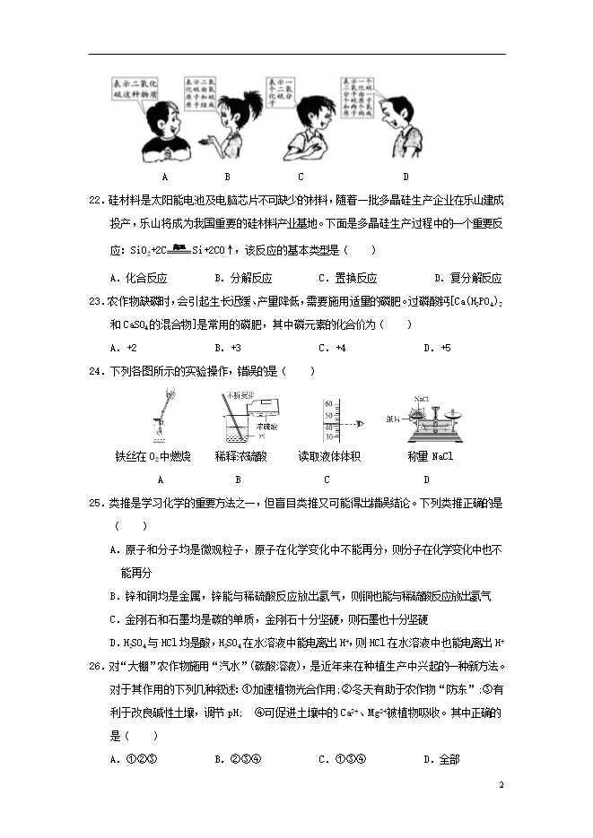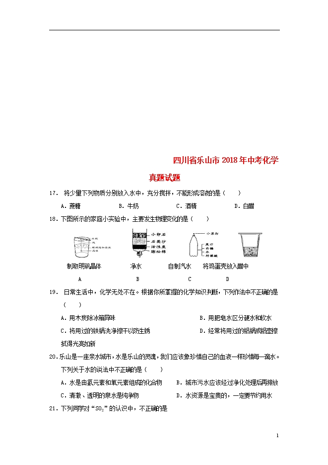 2018年四川省乐山市中考化学试题(word版含答案)