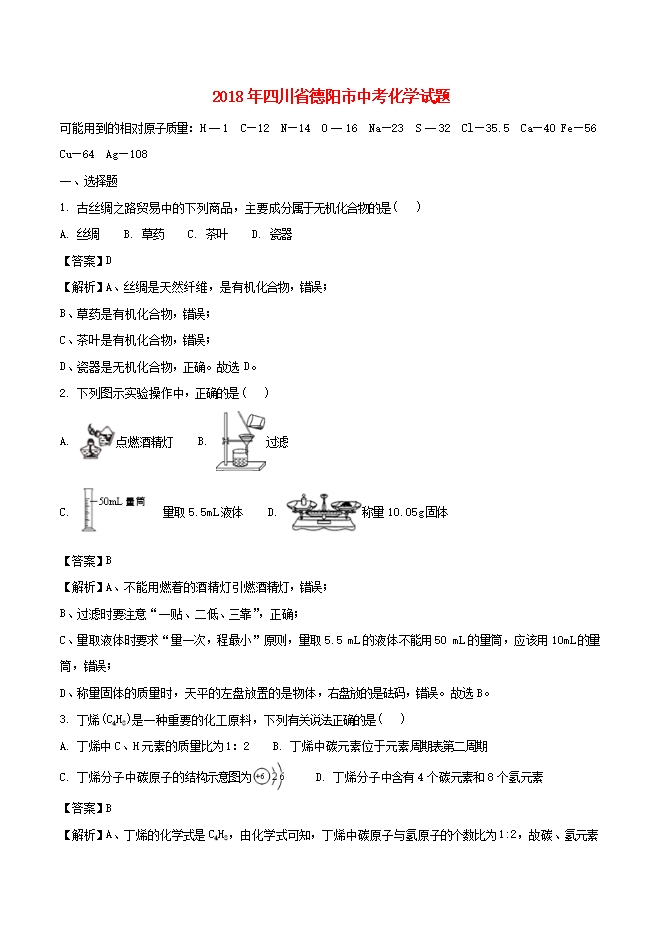 2018年四川省德阳市中考化学试题(word版,含答案解析)