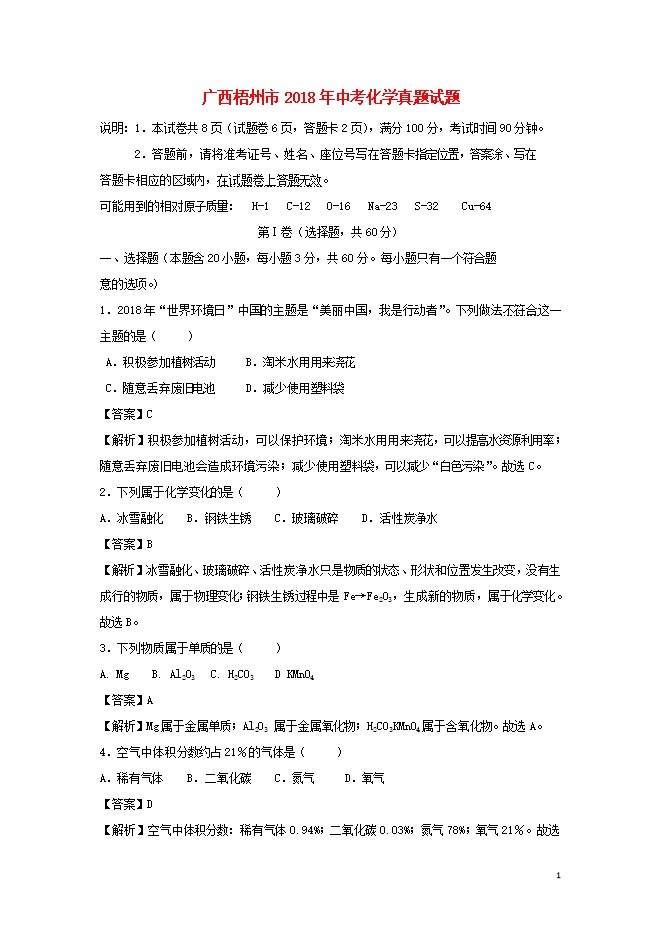 2018年广西梧州市中考化学试题(word版,含答案解析)