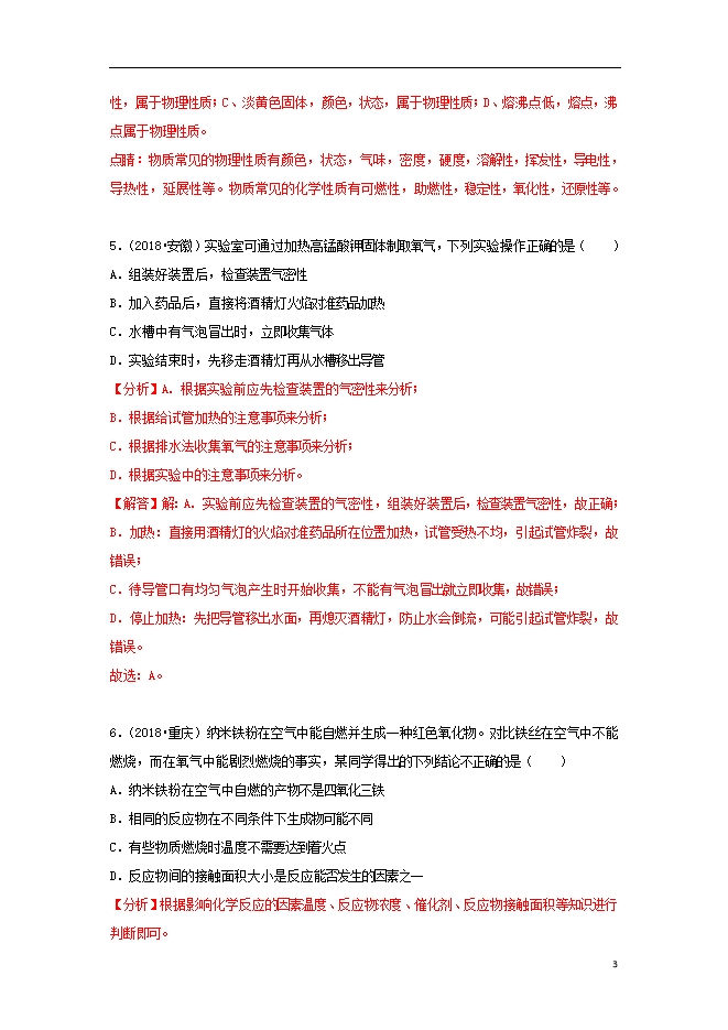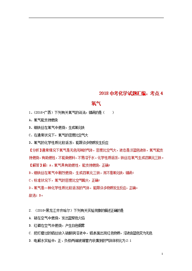 2018中考化学试题汇编(一)考点4氧气(含解析)