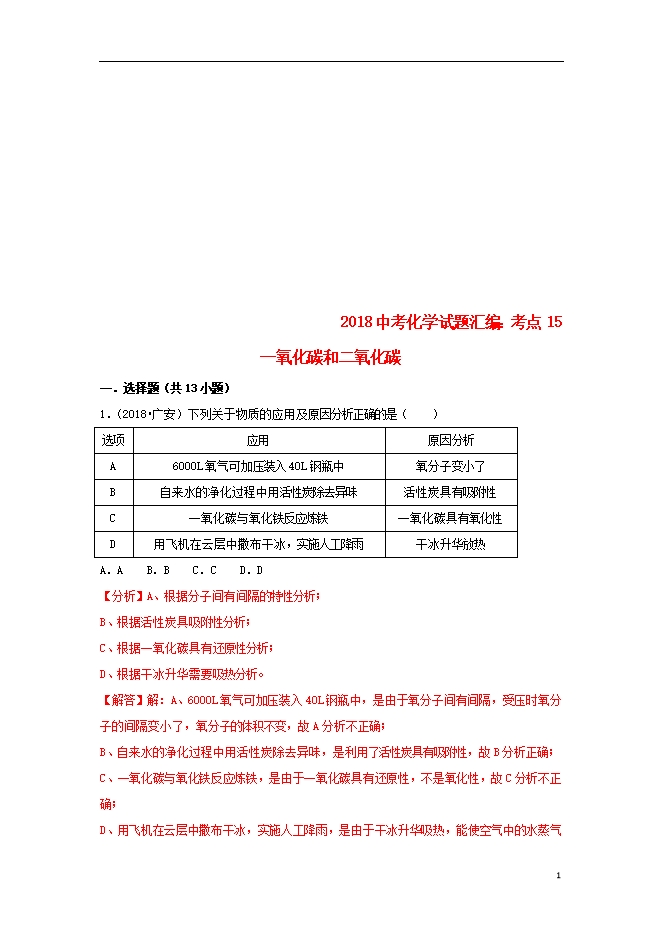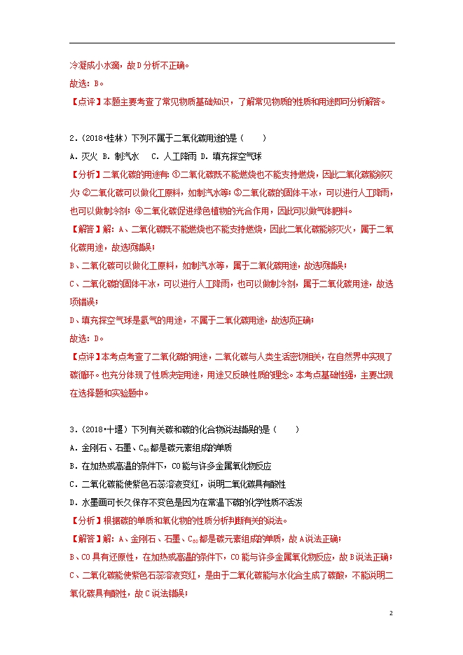 2018中考化学试题汇编(一)考点15一氧化碳和二氧化碳(含解析)