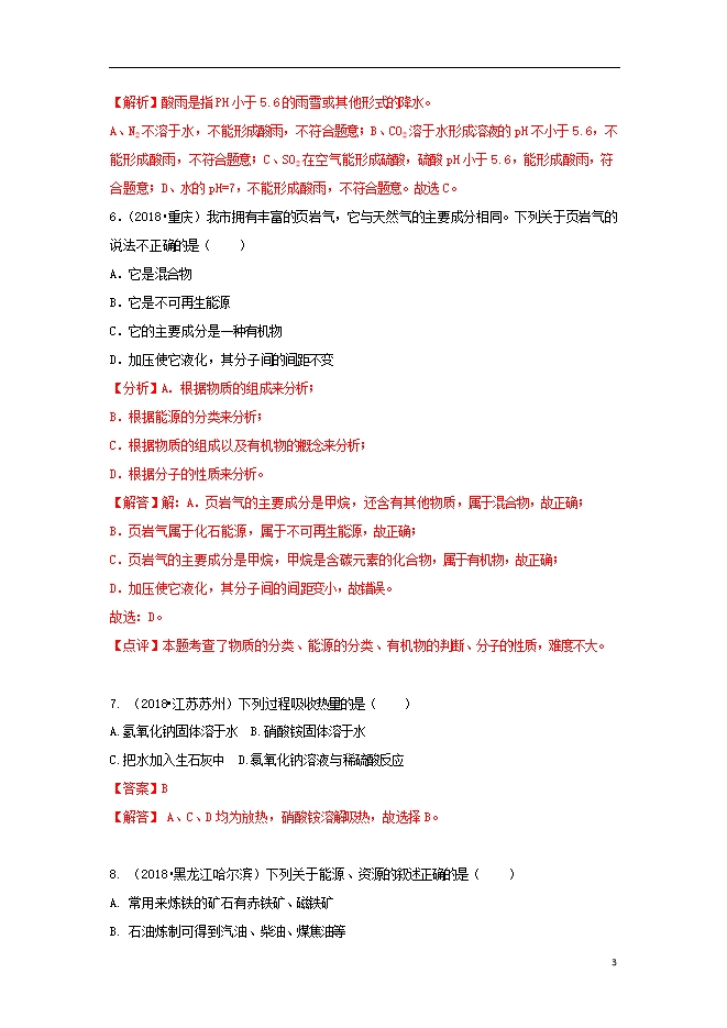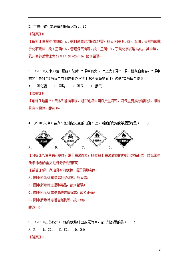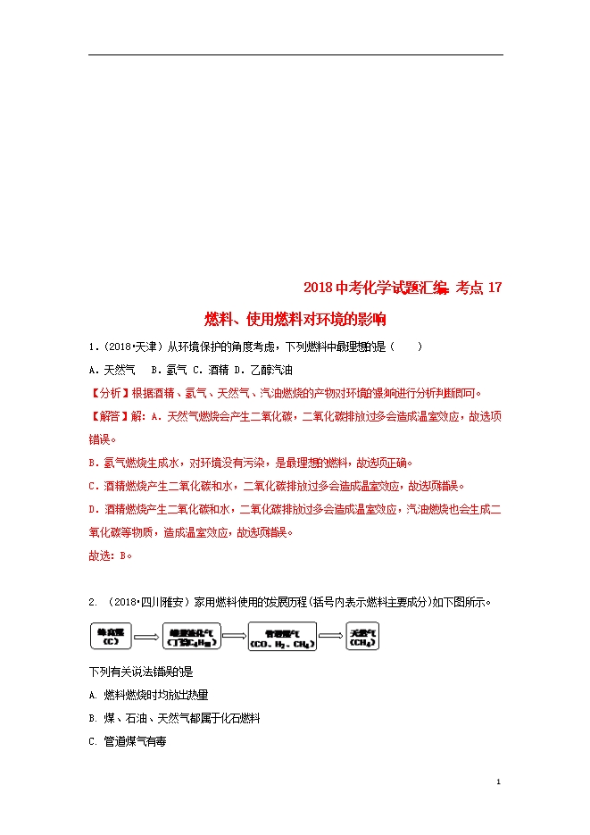 2018中考化学试题汇编(一)考点17燃料、使用燃料对环境的影响(含解析)
