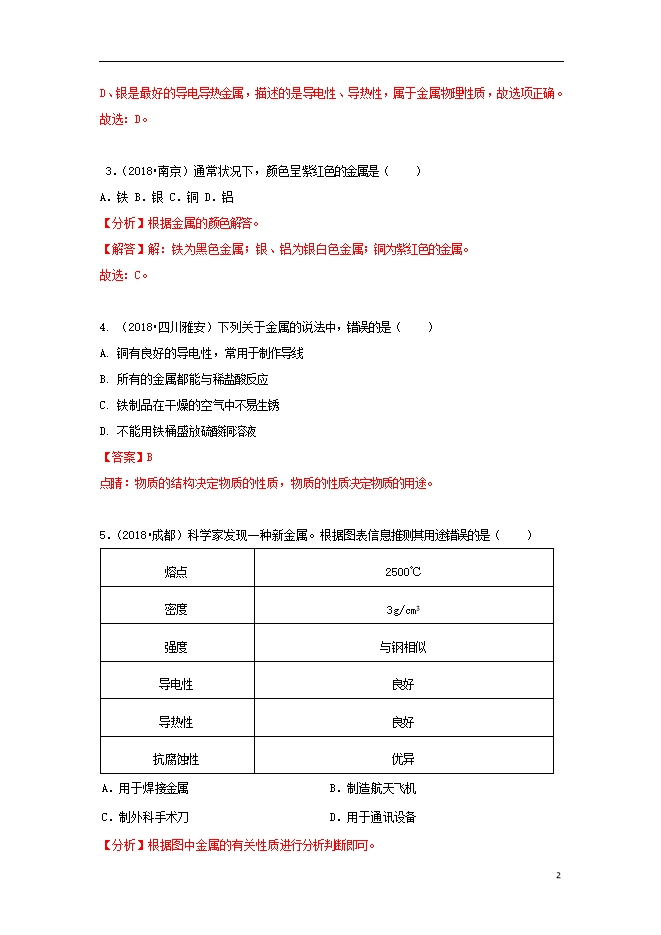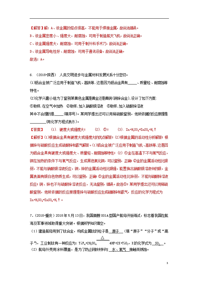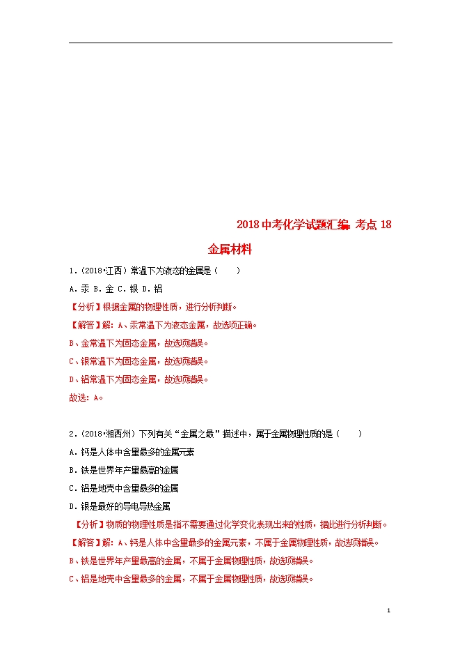 2018中考化学试题汇编(一)考点18金属材料(含解析)