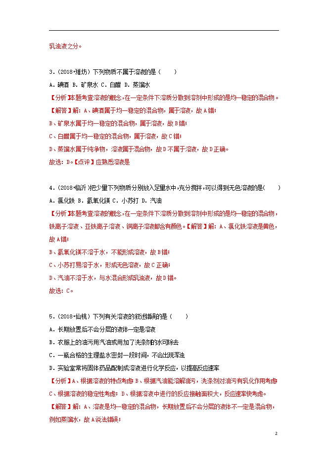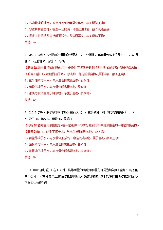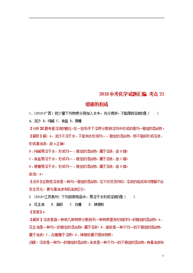 2018中考化学试题汇编(一)考点21溶液的形成(含解析)