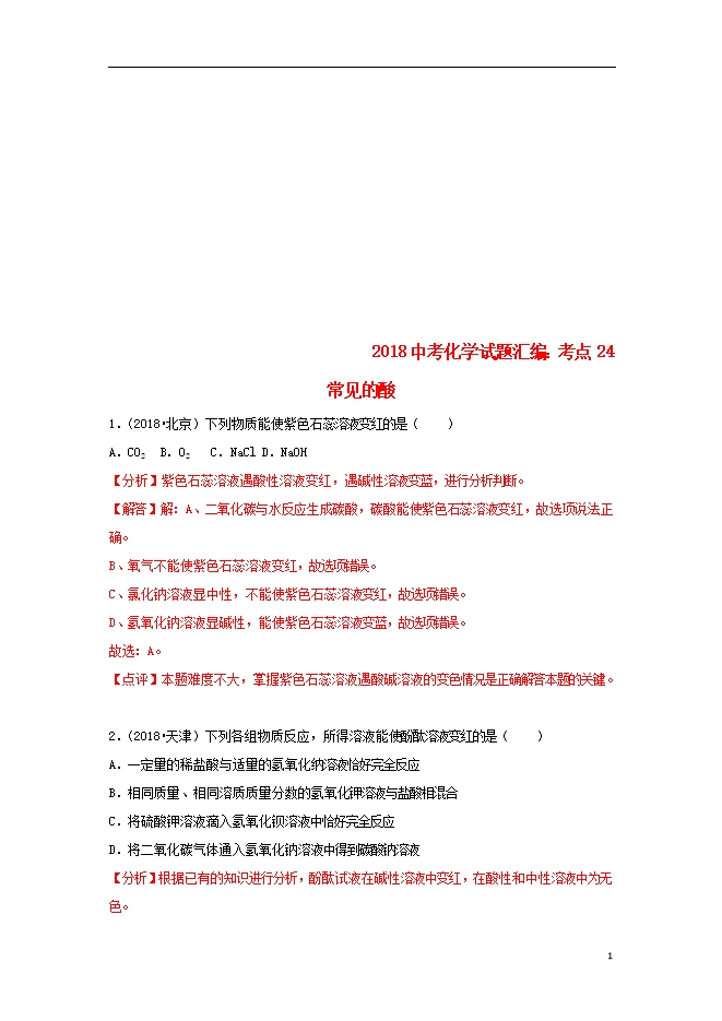 2018中考化学试题汇编(一)考点24常见的酸(含解析)